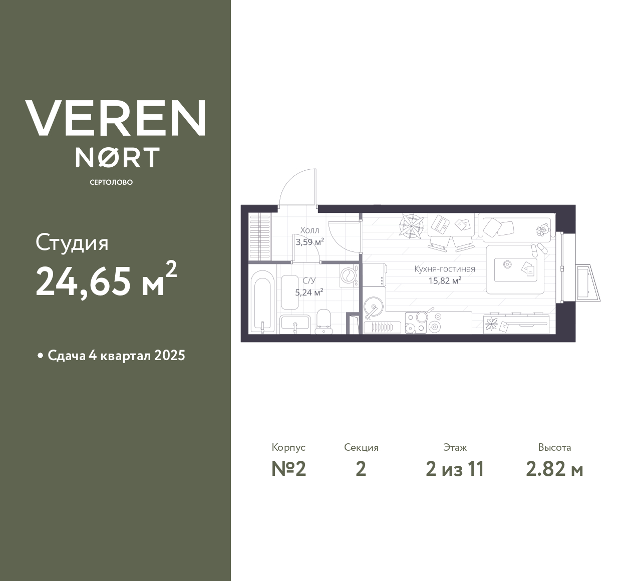 Квартира-студия, 24.65 м2 в ЖК "VEREN NORT Сертолово"