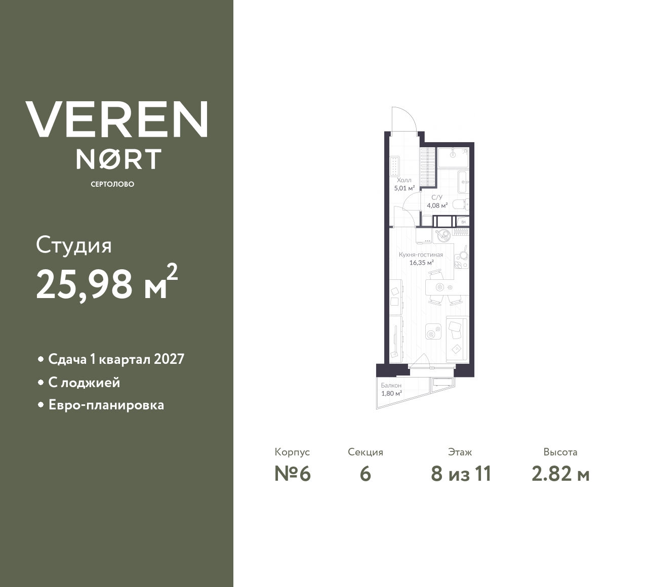 Квартира-студия, 25.98 м2 в ЖК "VEREN NORT Сертолово"