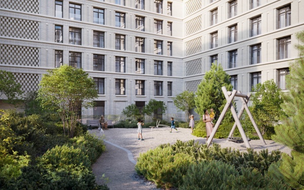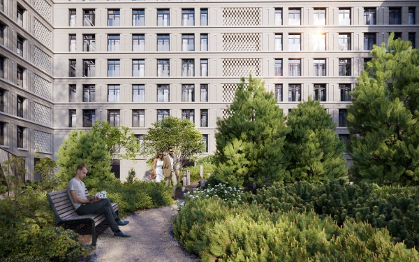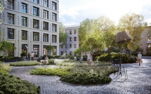 В приватном дворе разобьют пейзажный сад со взрослыми деревьями и многолетними кустарниками — всего 4500 растений, которые сохранят привлекательность круглый год. Здесь появятся деревянные скамейки, лёгкие металлические столы и стулья, уличные светильники-торшеры, чтобы во дворе можно было не только подышать свежим воздухом, но и поработать — свободный Wi-Fi на территории. В зоне «зелёной комнаты» установят уличные обогреватели.