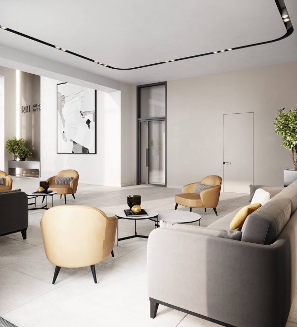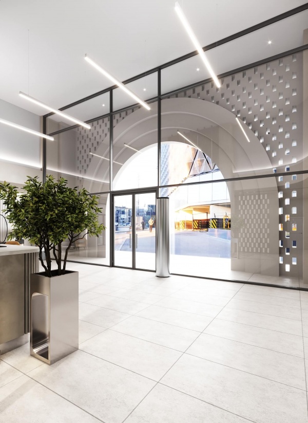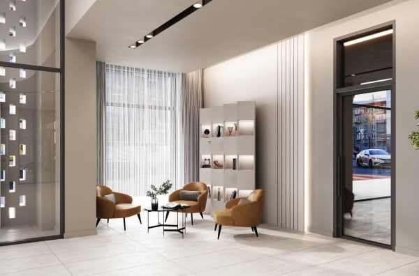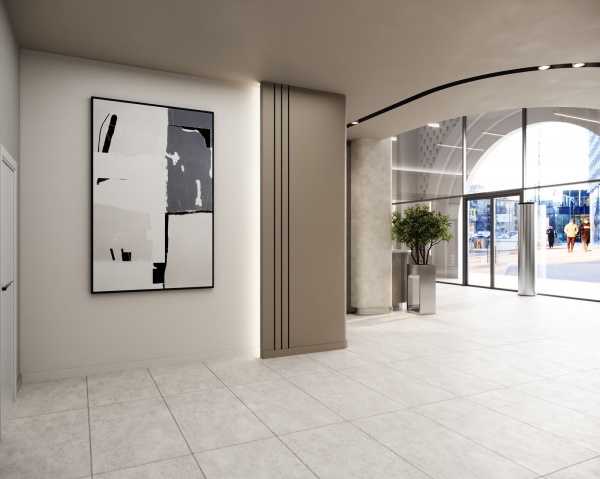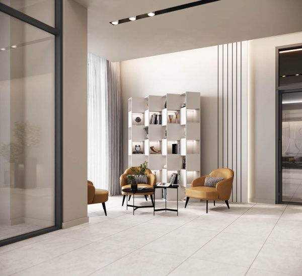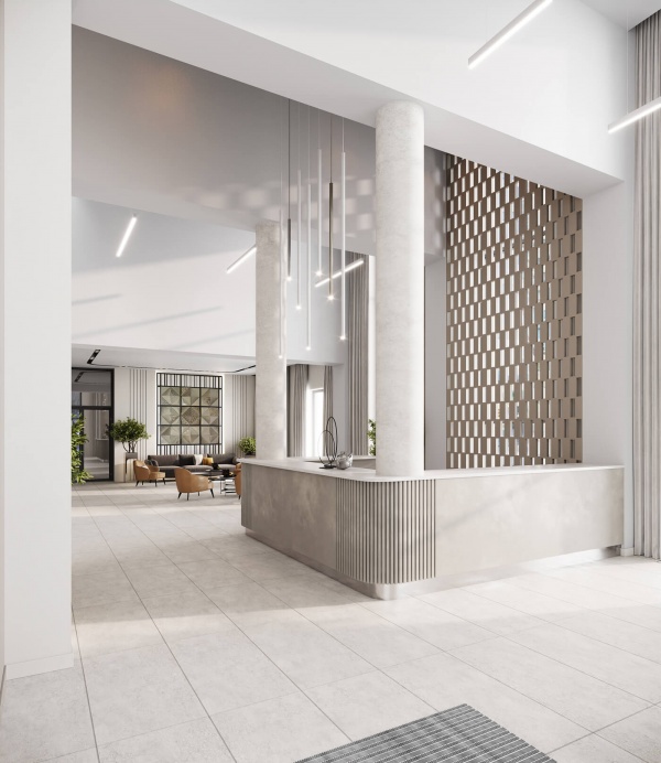 Специально для «Визионера» архитектор Евгений Герасимов разработал эксклюзивный паттерн по типу шахматной клетки. Этот орнамент отражает особый визионерский нрав дома и прослеживается не только в перфорированных панелях, которые структурируют пространство лобби, но и в декоративных нишах фасада. Ещё одним украшением парадного вестибюля станет серия интроспективных керамических панно художницы Юлии Клоповой: первое в своей визуальной форме воплощает интуицию, второе — стратегию.